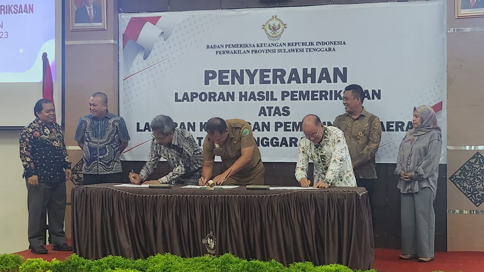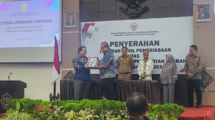 Badan Pemeriksa Keuangan (BPK) Perwakilan Provinsi Sulawesi Tenggara (Sultra) telah menyerahkan Laporan Hasil Pemeriksaan (LHP) atas Laporan Keuangan Pemerintah Daerah Tahun 2023, kepada Pemerintah Kabupaten (Pemkab) Konawe dan Dewan Perwakilan Rakyat Daerah (DPRD) di kantor BPK Sultra di Kota Kendari, Selasa 28 Mei 2024 yang diserahkan langsung oleh Kepala BPK Sultra, Dadek Nandemar.