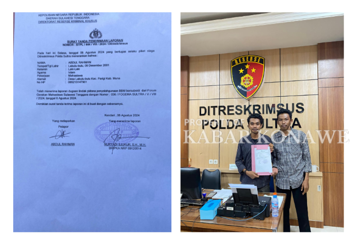 Kendari – Forum Gerakan mahasiswa Sulawesi tenggara (Forgema Sultra) laporkan dugaan praktek penimbunan Bahan Bakar Minyak (BBM) jenis solar Subsidi dan jual beli solar ilegal, di Desa Nii Tanasa, Kecamatan Lalonggasumeeto, Kabupaten Konawe, Selasa (06/08/2024).