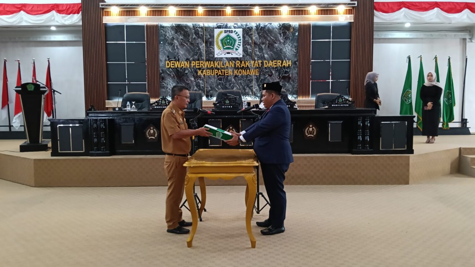 KONAWE – Dewan Perwakilan Rakyat Daerah (DPRD) Kabupaten Konawe menggelar Rapat Paripurna (Rapur) Penyampaian Laporan Keterangan Pertanggungjawaban (LKPJ) Kepala Daerah Kabupaten Konawe Tahun Anggaran 2024 dari Pemerintah Daerah kepada Dewan Konawe. Yang dipimpin langsung oleh Ketua DPRD Konawe I Made Asmaya, S.Pd, MM didampingi Wakil Ketua Nuryadin Tombili, ST dan dihadiri oleh Wakil Bupati H. Syamsul Ibrahim, SE, M.Si.